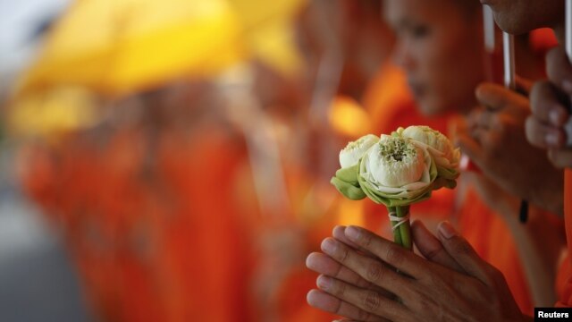 A Buddhist monk holds flowers as he joins others waiting for the coffin of the former king Norodom Sihanouk t